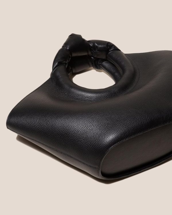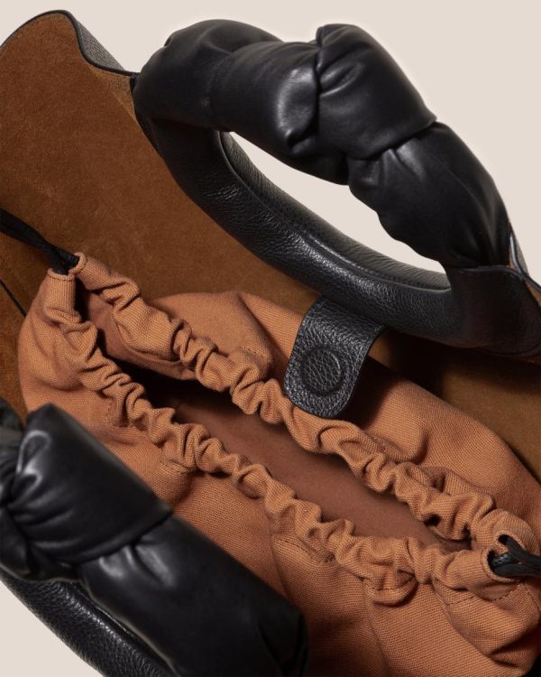 Knotted-handle basket tote crafted in Spanish grainy calf leather with calf leather lining. Made in Spain, by local artisans, celebrating excellence in craftsmanship.