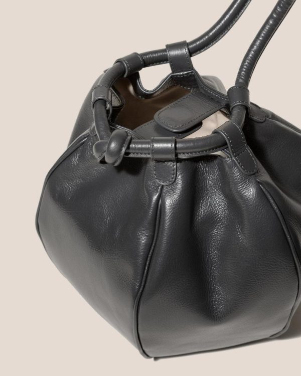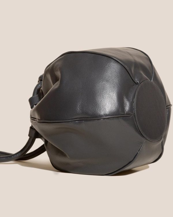 Balloon-shaped drawstring shoulder/tote bag crafted in distressed calf leather and lined with organic cotton canvas. It can be worn as a shoulder bag by pulling the strap to one side, or as a tote by pulling the straps evenly to both sides. Made in Spain by uniquely talented artisans, celebrating excellence in craftsma