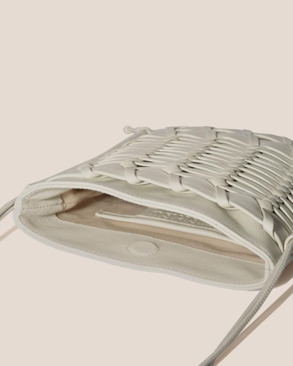 Flat square crossbody bag crafted in soft calf leather, with a handwoven front pocket. Made in Spain by uniquely talented artisans, celebrating excellence in craftsmanship.